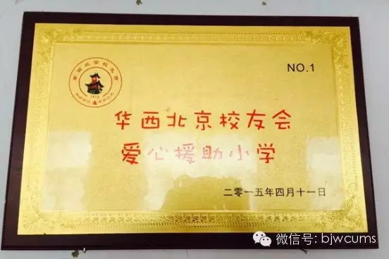 华西校友会爱心援助小学牌匾 华西北京校友会已经携手郝车倌小学开展近两年的爱心活动,在这两年的时间里,学生们和学校都经历了诸多可喜的变化。