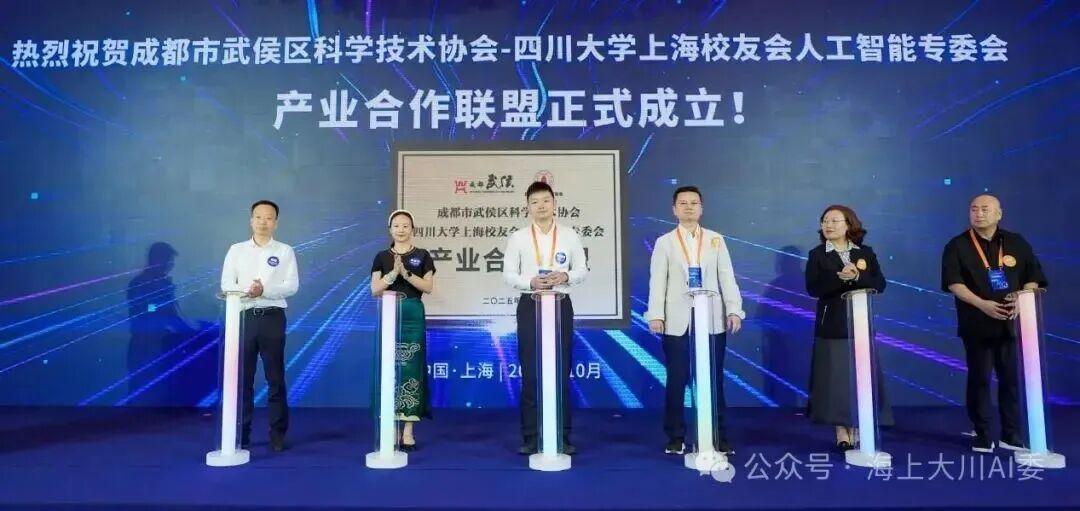同期,“成都市武侯区科学技术协会 — 四川大学上海校友会人工智能专委会产业联盟” 正式揭牌。该联盟既维系校友情谊、兼具务实合作功能,也为在沪校友搭建母校属地资源对接桥梁,助力技术转化与产业发展,成为武侯区链接长三角 AI 资源的重要纽带。