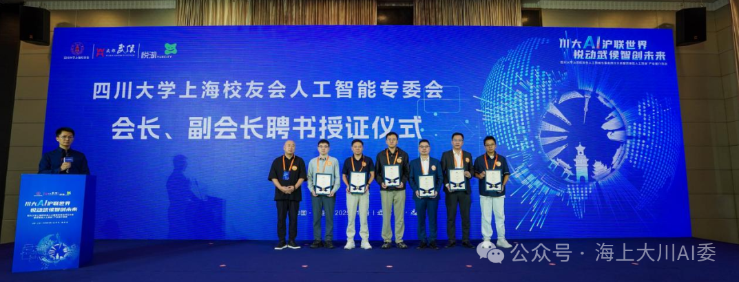 成立大会上,专委会正式揭牌,并由四川大学上海校友会会长王钢为专委会会长张东及6位副会长授予聘书,全博士阵容也凸显了人工智能专委会鲜明的高科技属性。