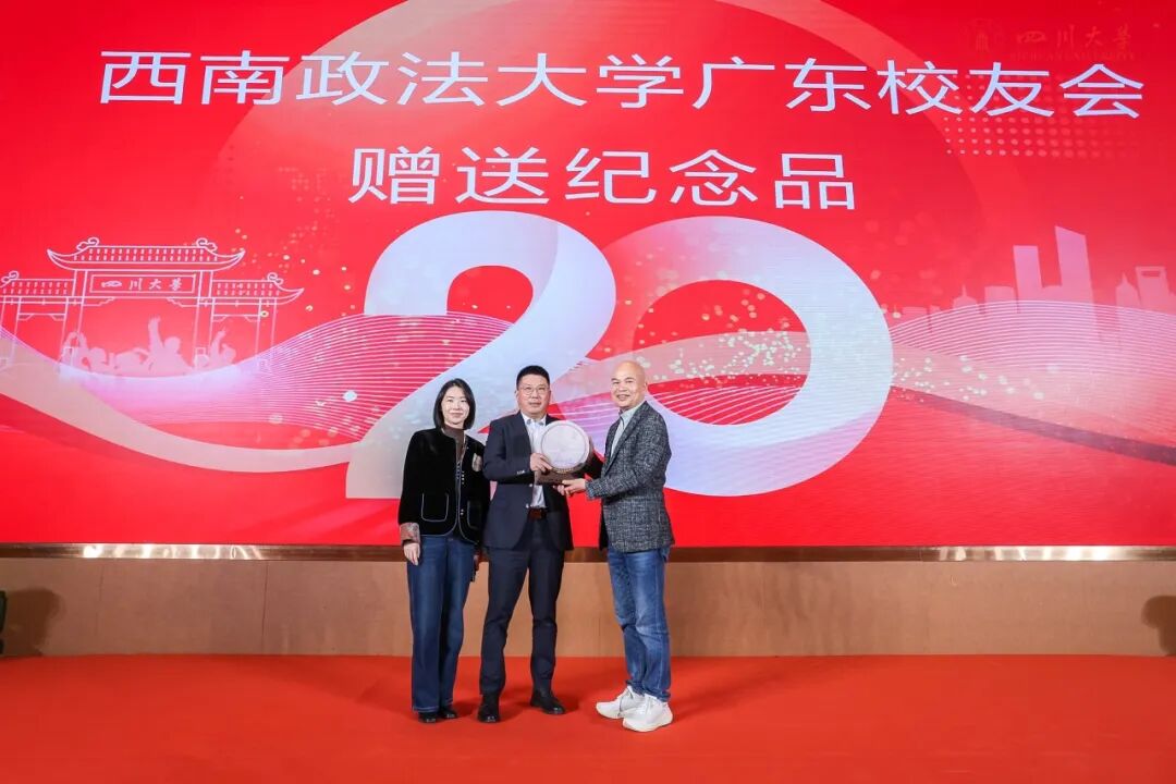 活动中,华东政法大学广东校友会副会长谈凌代表该会向川大广州校友会赠送“鹿披红带”纪念品,寓意“一鹿(路)长虹(红),友谊长虹,事业长虹”;黄秋练代表西南政法大学广东校友会向川大广州校友会赠送“檀韵玉鉴”纪念品,彰显了兄弟院校之间的深厚情谊。