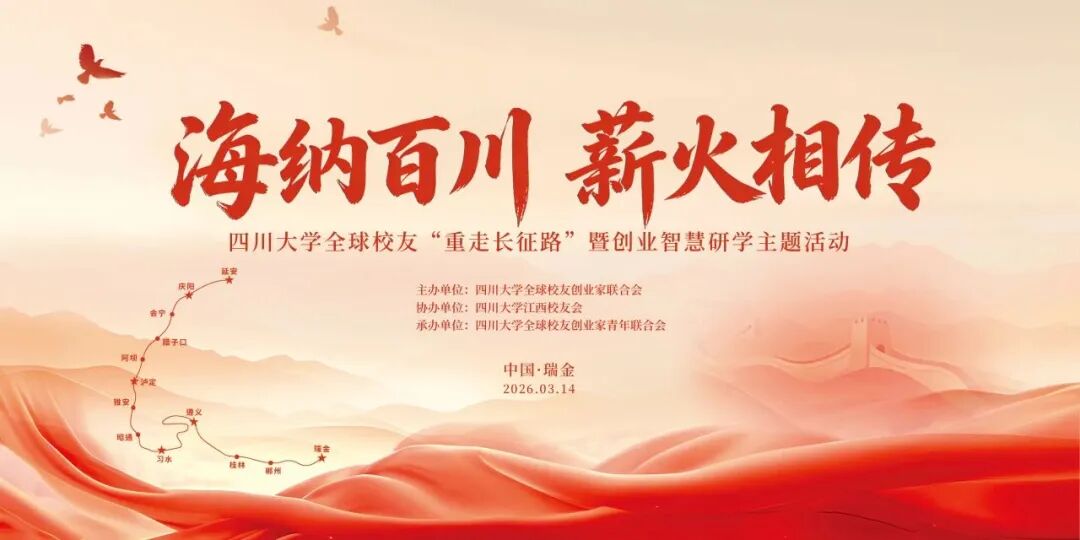 2026年3月13日至15日,由四川大学全球校友创业家联合会、四川大学江西校友会联合主办,四川大学全球校友创业家青年联合会承办、四川大学成都地区法学校友会协办的“重走长征路”系列活动首站,在红色故都、共和国摇篮、中央红军长征出发地瑞金和红军长征第一渡于都正式启航。来自四川、江西、香港、上海、山东等各地川大校友们从八方汇聚,循着先辈足迹,踏上了这趟“海纳百川,薪火相传”的初心征程,在历史与现实的交汇中,体悟长征精神,汲取奋进力量。